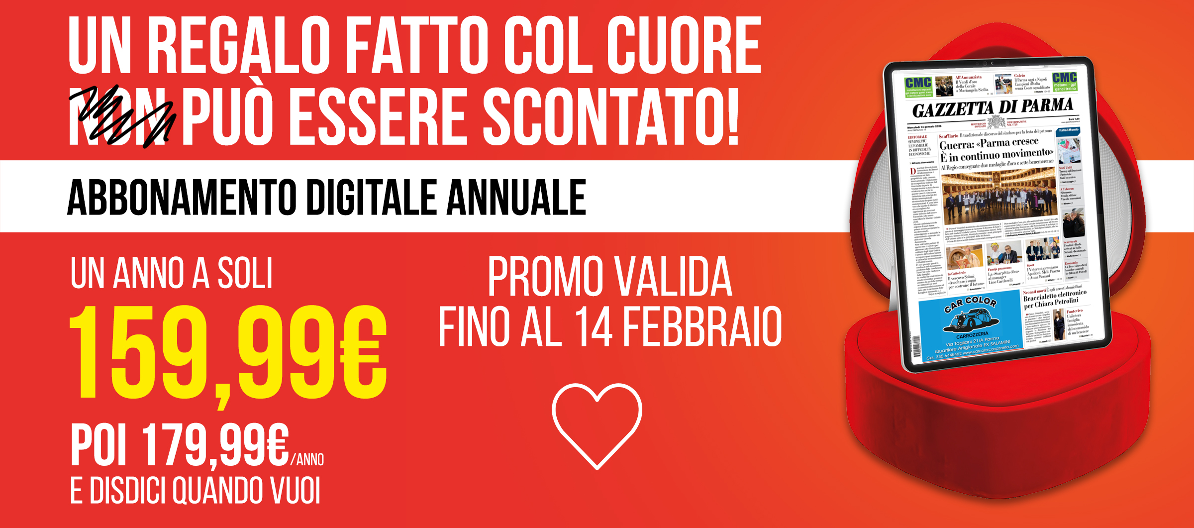 Con l'offerta di San Valentino sul digitale annuale, potrai abbonarti alla Gazzetta di Parma in formato digitale a soli 159.99€ per un anno con autorinnovo automatico a 179.99€ per gli anni successivi e disdire l'abbonamento in qualsiasi momento. Hai a disposizione 3 postazioni per leggere tutte le notizie del nostro quotidiano: 1 browser PC, 1 tablet e 1 smartphone. Cosa aspetti? Hai tempo fino al 14 febbraio! Approfitta della promozione!